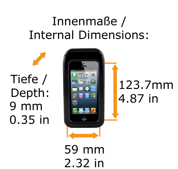 Die Hardbox / Handy-Case Aryca Xcite-5 passt auch für die Apple Oldtimer iPhones 5. Innenmaße: 123,7 mm x 59 mm x 9 mm. Bitte beachten Sie, dass eventuell nicht alle Knöpfe bedient werden können, der Touchscreen funktioniert aber.