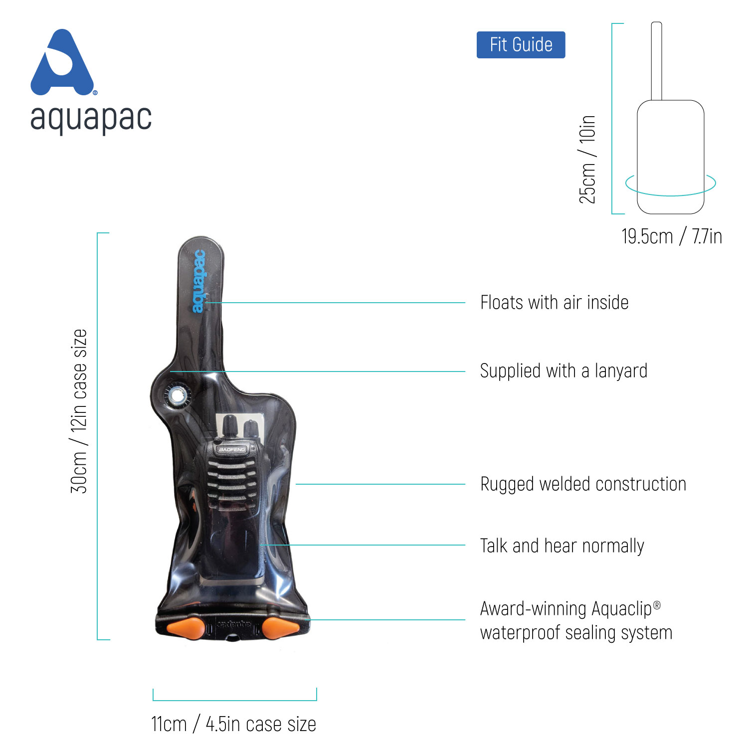 passt für Funkgeräte mit Antenne links oder rechts bis 330 Millimeter Länge. in unserer neuen grauen PVC-freien Folie. Klarsichtfenster vorn und hinten. Sie sprechen und hören durch die Tasche. Empfang (auch Bluetooth) und Bedienung sind durch die Folie kein Problem. schwimmfähig mit Handfunkgerät. garantiert 100% wasserdicht bis 10 Meter Wassertiefe gemäss IPX8. Das UV-stabilisierte TPU-Material wird durch Sonneneinwirkung nicht brüchig oder gelb. Salzwasserresistent. schützt auch gegen Staub, Sand oder Öl. Nato-Versorgungs-Nr.: 5820997305552 Ausgeliefert wird: mit einer verstellbaren Schlaufe/Lanyard. So können Sie die Tasche um den Hals tragen. Oder an der Kleidung. Oder befestigen, wo immer Sie wollen. in unserer neuen grauen Folie aus 300 Mu UV-TPU. ein Karabiner zum Tragen an der Kleidung oder Trockenmittel, um Kondenswasser zu verhindern, ist als Extra erhältlich.Inhalt nicht im Lieferumfang enthalten. Welche Größe passt?Die Tasche ‚Small VHF Classic’ passt für die meisten modernen Handfunkgeräte. Um herauszufinden, ob sie passt, messen Sie bitte und schauen in die Grafik darunter. Abmessung größtmögliches Gerät Abmessungen außen maximale Höhe des VHF inklusive Antenne: 330mmmaximaler Umfang: 195mmUnsere Kategorisierung: Tauchen und Schnorcheln: Die Taschen dieser Kategorie sind nach der IPX8-Norm vom Engineering Research Center am Imperial College, London, getest: das heißt, kontinuierliches Untertauchen nach Auswahl des Herstellers. Aquapac hat unter den Bedingungen von einer Stunde in fünf Meter Wassertiefe testen lassen - und natürlich bestanden. Ihr VHF unter extremen Bedingungen wie Sturm, Schnee, Regen oder Einsätzen zu benutzen, steht also nichts mehr im Wege (unsere Taschen sind auch schon tagelang im Wasser getrieben, ohne das Wasser eingedrungen ist). Was hält das Wasser draußen? Der patentierte Aquaclip® versiegelt die Tasche – mit einem einfachen Dreh an den Hebeln. Er wurde nach den härtesten internationalen Standards für Wasserdichtigkeit getestet. Wenn Sie noch keinen Aquaclip gesehen haben, erfahren Sie hier mehr. Im Einsatz Sie haben ein Handfunkgerät für Ihr Hobby oder im professionellen Einsatz. Ist es wasserdicht? Und ist es schwimmfähig? Falls eine oder beide Antworten ‘Nein’ lauten, brauchen Sie ein 100% wasserdichtes AQUAPAC. Ist Ihr Handfunkgerät mit einem AQUAPAC geschützt, benutzen Sie es wie gewohnt. Der luftdichte Verschluss macht das Funkgerät sogar schwimmfähig, wenn es über Bord geht. Die AQUAPACs wurden vom British Standards Institute (BSI, vergleichbar DIN) getestet und erfüllten die Norm IP68. Die Taschen sind 100% wasser- und luftdicht. Die AQ2-Serie für Funkgeräte ist bei der NATO erprobt und bei den Armeen verschiedener Nationen in Gebrauch: Das 228 hat die Nato-Versorgungsnr. 5820997305552. Was unsere Kunden sagen: "Ich benutze jetzt seit drei Jahren Aquapac Funkgerätetaschen – eine effektive Sache, um elektronische Geräte vor Korrosion zu schützen, egal ob gelagert oder in Benutzung." Julien Fudge, Indonesia "Die Aquapacs werden jetzt schon von unserem Lebensrettungs-Team am Aberdeen Beach benutzt. Und bis jetzt - brillant...!!!" Tim Hollis, President, Aberdeen Surf Rescue, UK Was die Presse sagt: "Viele Funkgeräte sind wasserresistent, aber nur wenige wasserdicht … Die neue VHF PRO Tasche von Aquapac macht da weiter, wo Wasserresistenz aufhört." Boating Life Magazine, www.boatinglifemag.com, USA