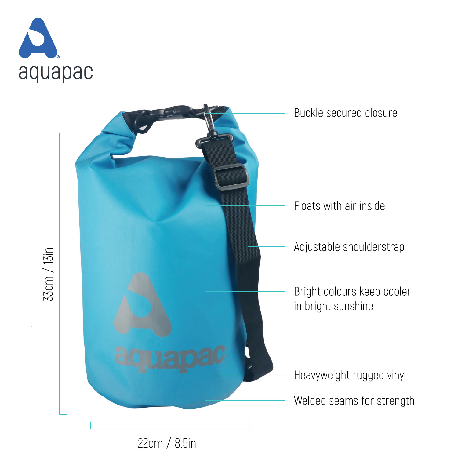 TrailProof™ wasserdichte, robuste und funktionale Drybags mit verstellbarem Schultergurt für Wassersport, Paddeln, Segeln, Wandern oder Expeditionen. Feartures: Aquapacs TrailProof™ Drybags mit Rollsiegelverschluss und Schultergurt. in 4 Größen: 7 Liter, 15 Liter, 25 Liter oder 70 Liter. natürlich wasserdicht nach IPX 6. Für Rafting, Camping, Expeditionen, Segeln oder Outdoor-Touren. Überall, wo es härter zugeht. Und wo größere Ausrüstungsgegenstände an nasse Plätze transportiert werden müssen. aus robusten 500D-Vinyl gefertigt, um allen Stößen standzuhalten, abriebfest. sehr leicht: 213 Gramm, 345 Gramm, 427 Gramm oder 764 Gramm. verschlossenes Rollsiegel als Tragegriff nutzbar. wahlweise lieferbar in coolem acid green oder cyan blue. Gut sichtbar sein, wenn du unterwegs bist. Durch die hellen Farben sind die Dry Bags leicht zu erkennen unter einem großen Berg anderer Taschen und die Tasche heizt sich in der Sonne nicht so stark auf.Inhalt nicht im Lieferumfang enthalten. Technische Daten: in 4 Größen: 7 Liter, 15 Liter, 25 Liter oder 70 Liter leicht: 243 Gramm, 375 Gramm, 457 Gramm oder 794 Gramm. aus 500D verstärktem Vinyl. mit verstellbarem Schultergurt Die Maße (Verschluss aufgerollt): TrailProof™ Drybag 7 Liter TrailProof™ Drybag 15 Liter TrailProof™ Drybag 25 Liter TrailProof™ Drybag 70 Liter Maße 7 Liter: Höhe (gerollt) 280mm, Durchmesser: 180mmMaße 15 Liter: Höhe (gerollt) 380mm, Durchmesser 240mmMaße 25 Liter: Höhe (gerollt) 500mm, Durchmesser: 240mmMaße 70 Liter: Höhe (gerollt) 760mm, Durchmesser 320mm Unsere Kategorisierung: Wasserdicht: Die Taschen der IPX6-Norm widerstehen kurzem Untertauchen und schwimmen auf der Wasseroberfläche, ohne das ihr Inhalt feucht wird. Sie sind geeignet für Reisen, Wandern, Segeln, Paddeln, Raften oder anderen Wassersportaktivitäten sowie allen Aktivitäten rund um Strand und Meer oder Schnee und Regen. Seit Jahren ist das Rollsystem ein industrieller Standard, um Taschen wasserdicht zu verschließen. Wir benutzen speziell gehärtete Säume, um ein straffes Aufrollen zu gewährleisten. Solange du den Verschluss dreimal aufrollst, kann kein Wasser eindringen, der TrailProof™ Drybag ist dann auch gegen gelegentliches Eintauchen geschützt. Noch ein Tipp: Je mehr Luft du einschließen kannst, desto dichter hält das Rollsystem. Für Unterwasseraktivitäten ist die Tasche nicht geeignet. Was hält das Wasser draußen? Du rollst das obere Ende der Tasche dreimal auf und schließt die Klickverschlüsse. Schon kann kein Regen oder Spritzwasser mehr eindringen.Im Einsatz: Du kannst eine Menge Gepäck wasserdicht in dieser Tasche verstauen. Wenn du unterwegs bist, zum Beispiel an Bord gehst, bei der Rafting-Tour, beim Camping oder bei Expeditionen wie der Ausrüstung eines Basis-Camps. Die Tasche ist leicht, so dass du allein schon dadurch mehr einpacken kannst, statt auf das letzte Gramm achten zu müssen, wenn es schwer wird. Und zum komfortableren Tragen haben wir einen Schultergurt spendiert. Und wenn es regnet oder es einmal etwas rauher wird: Es kommt kein Wasser in die Tasche. Abends hast du immer noch trockene Sachen, wenn es zum Essen geht oder du gemütlich den Tag ausklingen läßt. Wo auch immer. Etwa am Lagerfeuer.