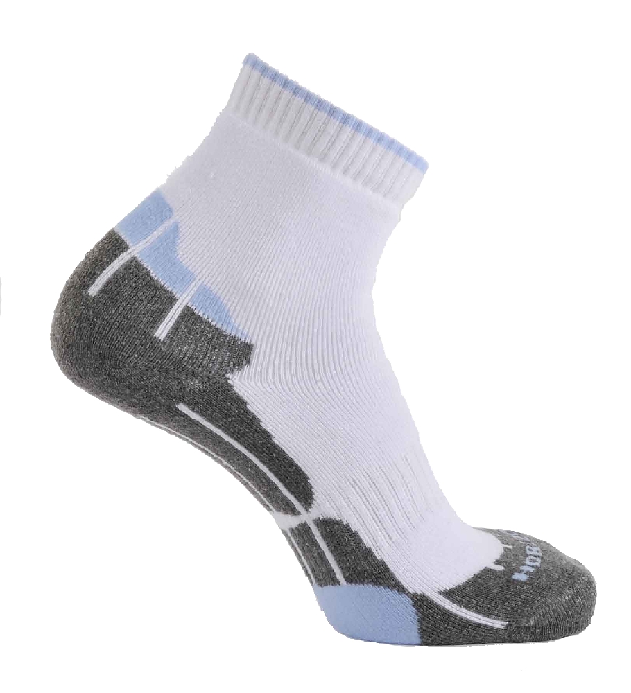 Premium Coolmax® Quarter Golf Socke aus superweicher gekämmter Baumwolle, wunderbar bequem, extra gepolsterte Sohle für extra Schutz & Strapazierfähigkeit. Die Coolmax® Sohle leitet die Feuchtigkeit ab und hält die Füße in Topform, stützenden Zonen verhindern Verrutschen, die weiche Zehennaht vermindert Blasenbildung. In der Farbe: weiß-hellblau-grau.