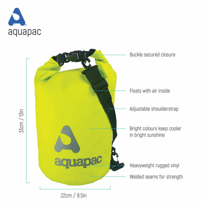 TrailProof™ wasserdichte, robuste und funktionale Drybags mit verstellbarem Schultergurt für Wassersport, Paddeln, Segeln, Wandern oder Expeditionen. Feartures: Aquapacs TrailProof™ Drybags mit Rollsiegelverschluss und Schultergurt. in 4 Größen: 7 Liter, 15 Liter, 25 Liter oder 70 Liter. natürlich wasserdicht nach IPX 6. Für Rafting, Camping, Expeditionen, Segeln oder Outdoor-Touren. Überall, wo es härter zugeht. Und wo größere Ausrüstungsgegenstände an nasse Plätze transportiert werden müssen. aus robusten 500D-Vinyl gefertigt, um allen Stößen standzuhalten, abriebfest. sehr leicht: 213 Gramm, 345 Gramm, 427 Gramm oder 764 Gramm. verschlossenes Rollsiegel als Tragegriff nutzbar. wahlweise lieferbar in coolem acid green oder cyan blue. Gut sichtbar sein, wenn du unterwegs bist. Durch die hellen Farben sind die Dry Bags leicht zu erkennen unter einem großen Berg anderer Taschen und die Tasche heizt sich in der Sonne nicht so stark auf.Inhalt nicht im Lieferumfang enthalten. Technische Daten: in 4 Größen: 7 Liter, 15 Liter, 25 Liter oder 70 Liter leicht: 243 Gramm, 375 Gramm, 457 Gramm oder 794 Gramm. aus 500D verstärktem Vinyl. mit verstellbarem Schultergurt Die Maße (Verschluss aufgerollt): TrailProof™ Drybag 7 Liter TrailProof™ Drybag 15 Liter TrailProof™ Drybag 25 Liter TrailProof™ Drybag 70 Liter Maße 7 Liter: Höhe (gerollt) 280mm, Durchmesser: 180mmMaße 15 Liter: Höhe (gerollt) 380mm, Durchmesser 240mmMaße 25 Liter: Höhe (gerollt) 500mm, Durchmesser: 240mmMaße 70 Liter: Höhe (gerollt) 760mm, Durchmesser 320mm Unsere Kategorisierung: Wasserdicht: Die Taschen der IPX6-Norm widerstehen kurzem Untertauchen und schwimmen auf der Wasseroberfläche, ohne das ihr Inhalt feucht wird. Sie sind geeignet für Reisen, Wandern, Segeln, Paddeln, Raften oder anderen Wassersportaktivitäten sowie allen Aktivitäten rund um Strand und Meer oder Schnee und Regen. Seit Jahren ist das Rollsystem ein industrieller Standard, um Taschen wasserdicht zu verschließen. Wir benutzen speziell gehärtete Säume, um ein straffes Aufrollen zu gewährleisten. Solange du den Verschluss dreimal aufrollst, kann kein Wasser eindringen, der TrailProof™ Drybag ist dann auch gegen gelegentliches Eintauchen geschützt. Noch ein Tipp: Je mehr Luft du einschließen kannst, desto dichter hält das Rollsystem. Für Unterwasseraktivitäten ist die Tasche nicht geeignet. Was hält das Wasser draußen? Du rollst das obere Ende der Tasche dreimal auf und schließt die Klickverschlüsse. Schon kann kein Regen oder Spritzwasser mehr eindringen.Im Einsatz: Du kannst eine Menge Gepäck wasserdicht in dieser Tasche verstauen. Wenn du unterwegs bist, zum Beispiel an Bord gehst, bei der Rafting-Tour, beim Camping oder bei Expeditionen wie der Ausrüstung eines Basis-Camps. Die Tasche ist leicht, so dass du allein schon dadurch mehr einpacken kannst, statt auf das letzte Gramm achten zu müssen, wenn es schwer wird. Und zum komfortableren Tragen haben wir einen Schultergurt spendiert. Und wenn es regnet oder es einmal etwas rauher wird: Es kommt kein Wasser in die Tasche. Abends hast du immer noch trockene Sachen, wenn es zum Essen geht oder du gemütlich den Tag ausklingen läßt. Wo auch immer. Etwa am Lagerfeuer.